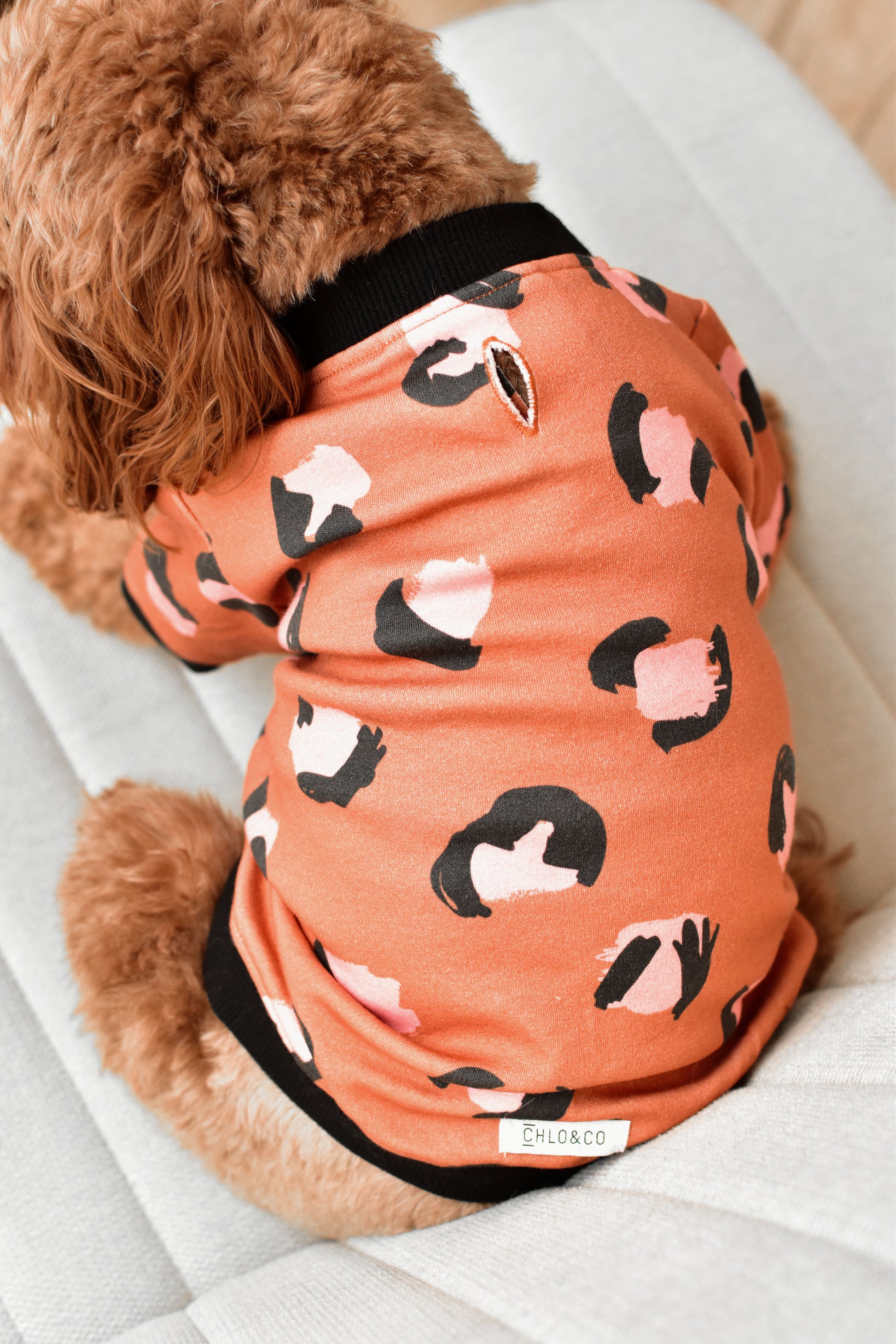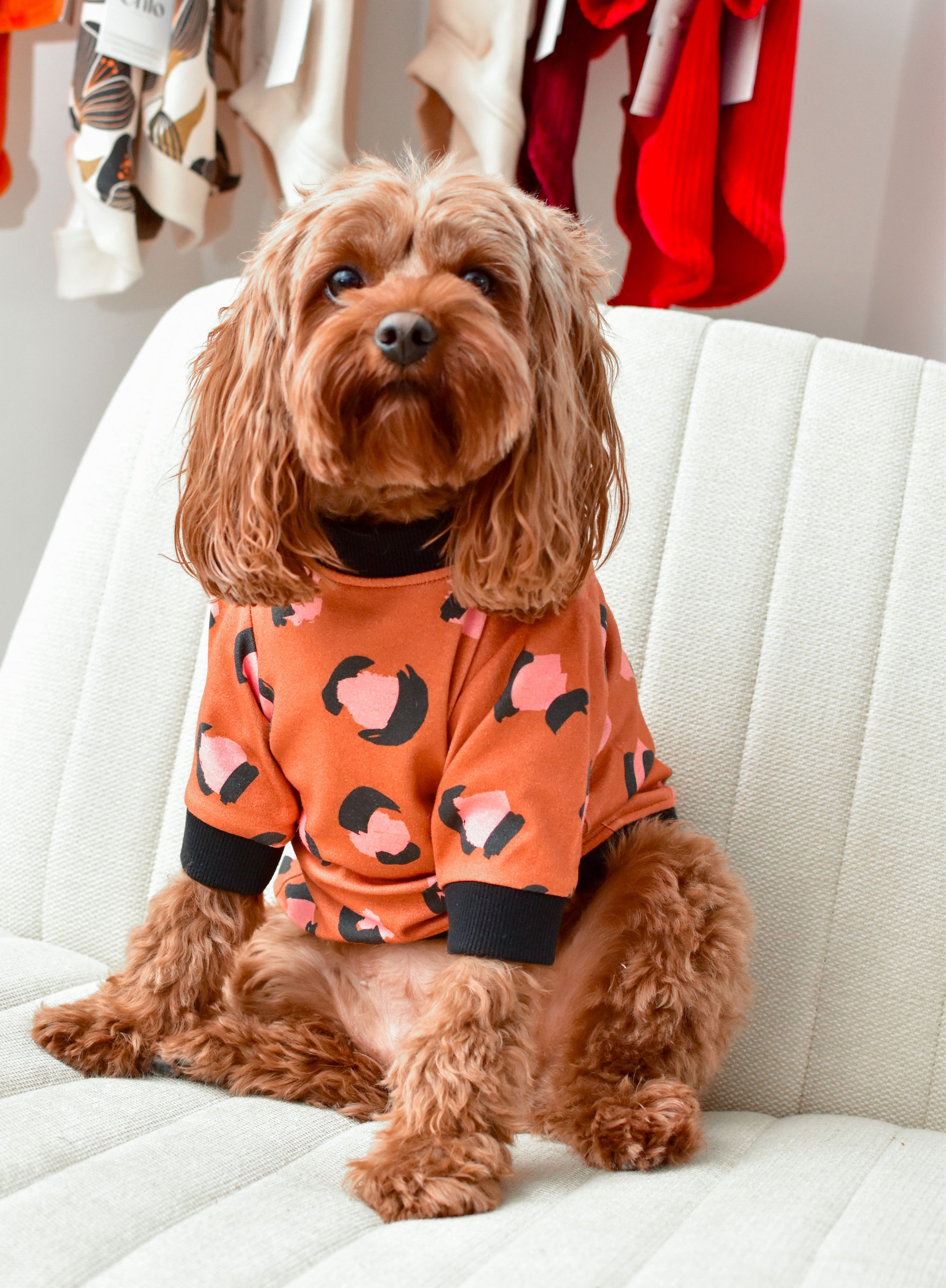 Give your pup a fashion-forward look with this cheetah sweatshirt that's made for action! Crafted from gentle organic cotton, it showcases a playful cheetah pattern in bronze and orange that stands out from the crowd. The fitted black rib trim ensures a comfortable fit whether your furry friend is chasing squirrels or lounging at home. Perfect for keeping them cozy and cute during every outing and playtime adventure.